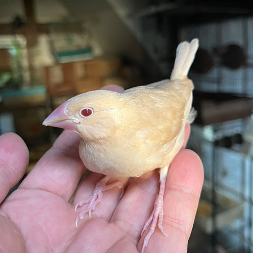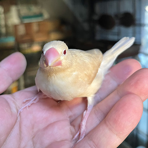 今年は文鳥ヒナの足が遅いです。夏が長かったせいか、やっと卵を抱き始めています。そんな中1羽だけ分けてもらった、クリーム文鳥とってもいい子です。