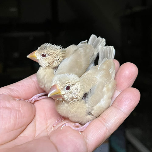 人気のシナモン文鳥です!3週齢の可愛い子。さし餌をたのしみたい方でも、まだまだ甘えん坊状態です。ヒナの内のクリームとの見分けは尾羽の色の濃さです。
