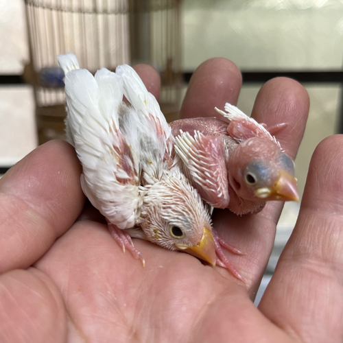 久しぶりの入荷、白文鳥のヒナです。1羽はとっても小さいけど、写真撮影から3~4日で見違えるほどに成長しています(^-^)。