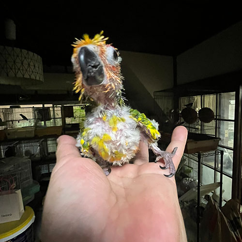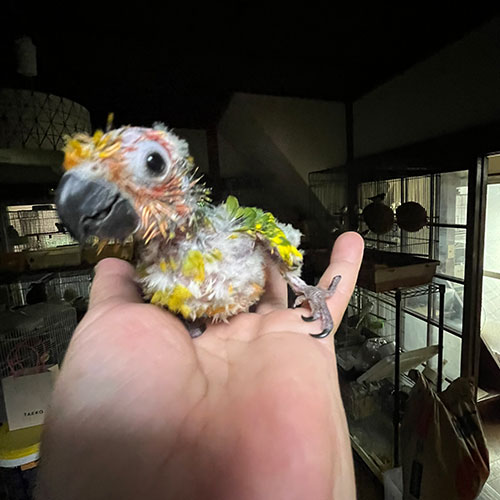大きな雛ですが、良く慣れるコニュア系です。こんなヒナの内から大きな声で良く鳴きます(;^_^A。好きな人は好きな、中型インコ「コガネメキシコインコ」1羽しかいないので、早い者勝ちです(*´Д`)。