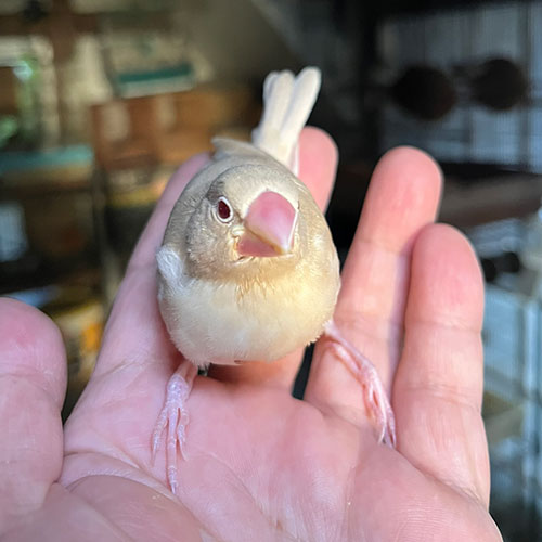 今年は文鳥ヒナの足が遅いです。夏が長かったせいか、やっと卵を抱き始めています。そんな中1羽だけ分けてもらった、クリーム文鳥とってもいい子です。