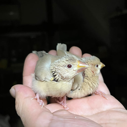 人気のシナモン文鳥です!3週齢の可愛い子。さし餌をたのしみたい方でも、まだまだ甘えん坊状態です。ヒナの内のクリームとの見分けは尾羽の色の濃さです。
