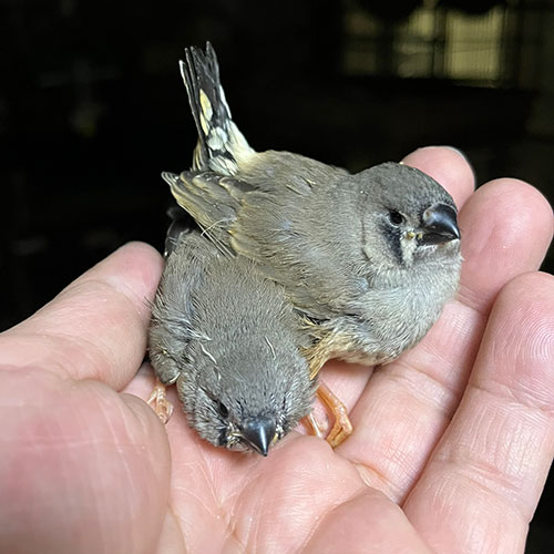 写真右の先に生まれた子はオスっぽいです。胸の黒色が見え隠れしているので、ブラックブレストの血が混ざっているかもですね。涙腺も太いのでbbbcのメスの線も考えられるけど…。キンカチョウは種類が多すぎるので、ヒナの内から確実なカラーが提示できないことは想定に入れておいて下さいm(__)m。