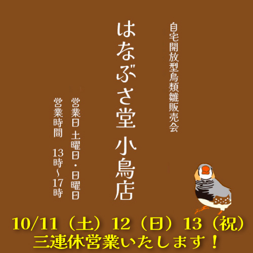 その他 | *基本は土日開催メインとなります。 *「小鳥茶会」というタイトルですが、飲食物の販売はしておりません。 また、はなぶさ堂では繁殖業務を主としており自宅開放型の小鳥サロンですので、ご来訪の際は完全予約制でお願いしております。お店やカフェではありませんのでご了承ください。 |