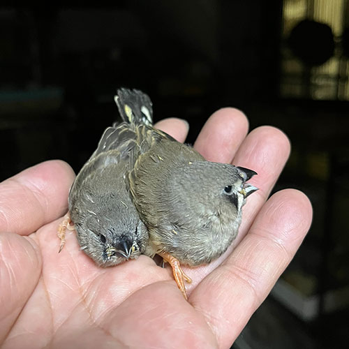 写真右の先に生まれた子はオスっぽいです。胸の黒色が見え隠れしているので、ブラックブレストの血が混ざっているかもですね。涙腺も太いのでbbbcのメスの線も考えられるけど…。キンカチョウは種類が多すぎるので、ヒナの内から確実なカラーが提示できないことは想定に入れておいて下さいm(__)m。