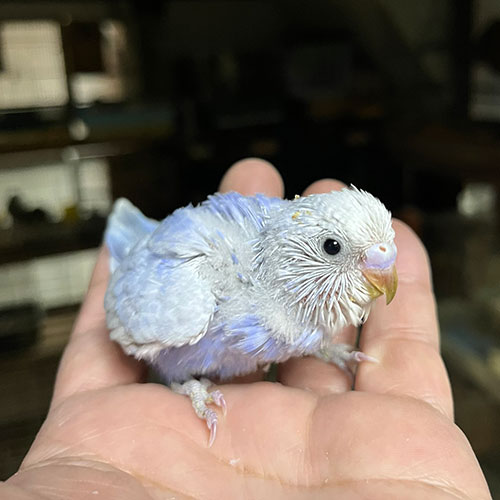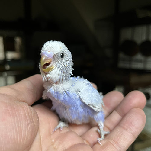 お待ちかねのライラックセキセイ(^_^)。3羽孵ったのですが1羽だけ先に大きくなってしまって…。他の2羽が育たないので、先に親元から卒業してもらいました。